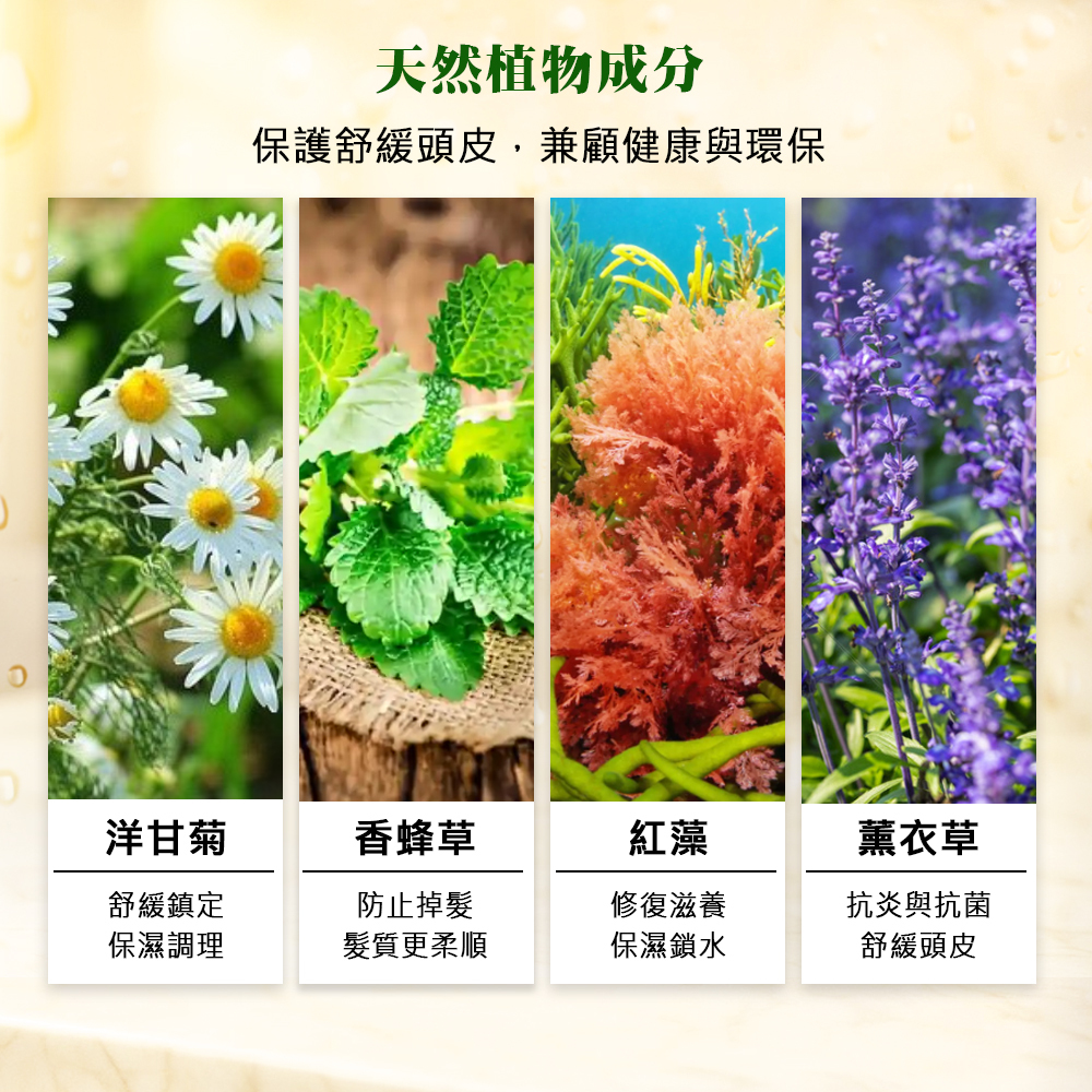 -蘆薈、何首烏、人蔘、甘草、洋甘菊、香蜂草、紅藻、薰衣草