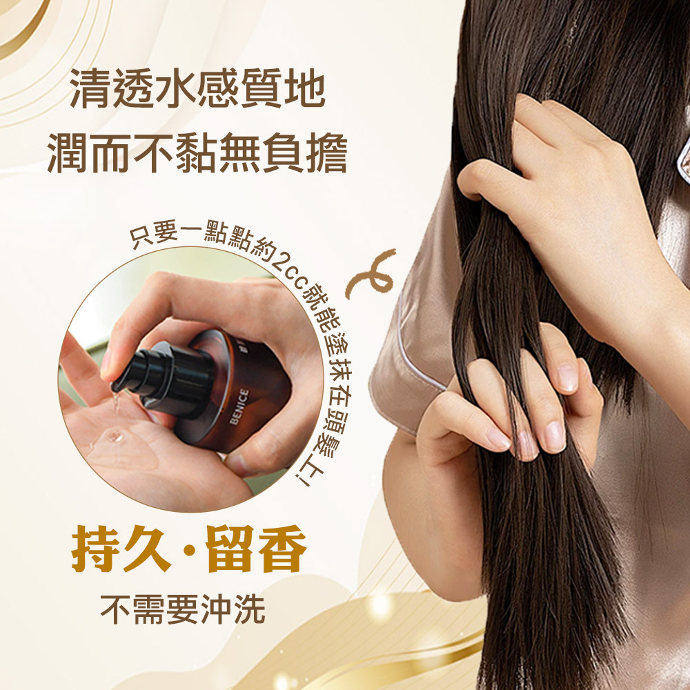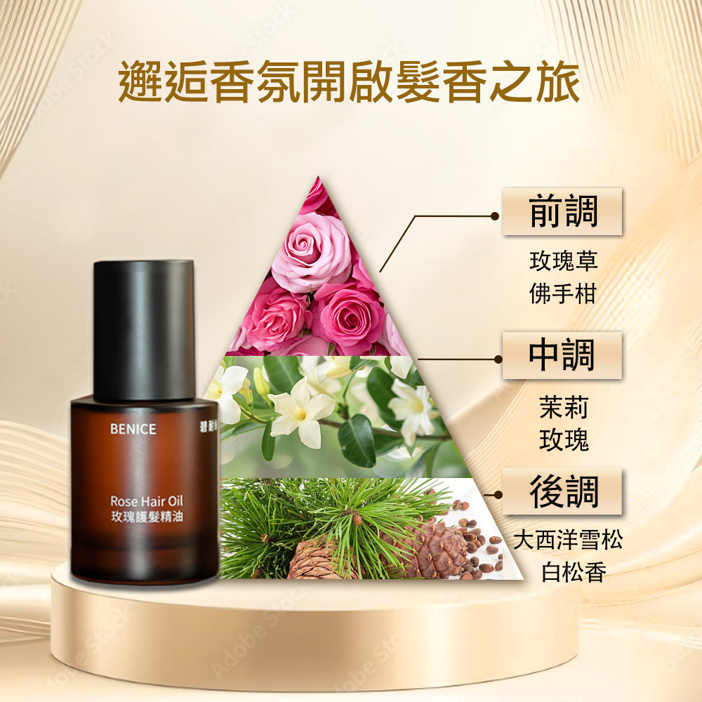 以香氛為靈魂,前調玫瑰草與佛手柑清新明亮,中調茉莉與玫瑰溫柔交融,後調雪松與白松香靜謐收尾,打造專屬髮香儀式。針對染燙受損、乾枯打結等困擾,持續修護可見光澤提升,日常使用輕鬆打造質感髮型。Benice,不只是護髮,更是妳質感生活的開始。