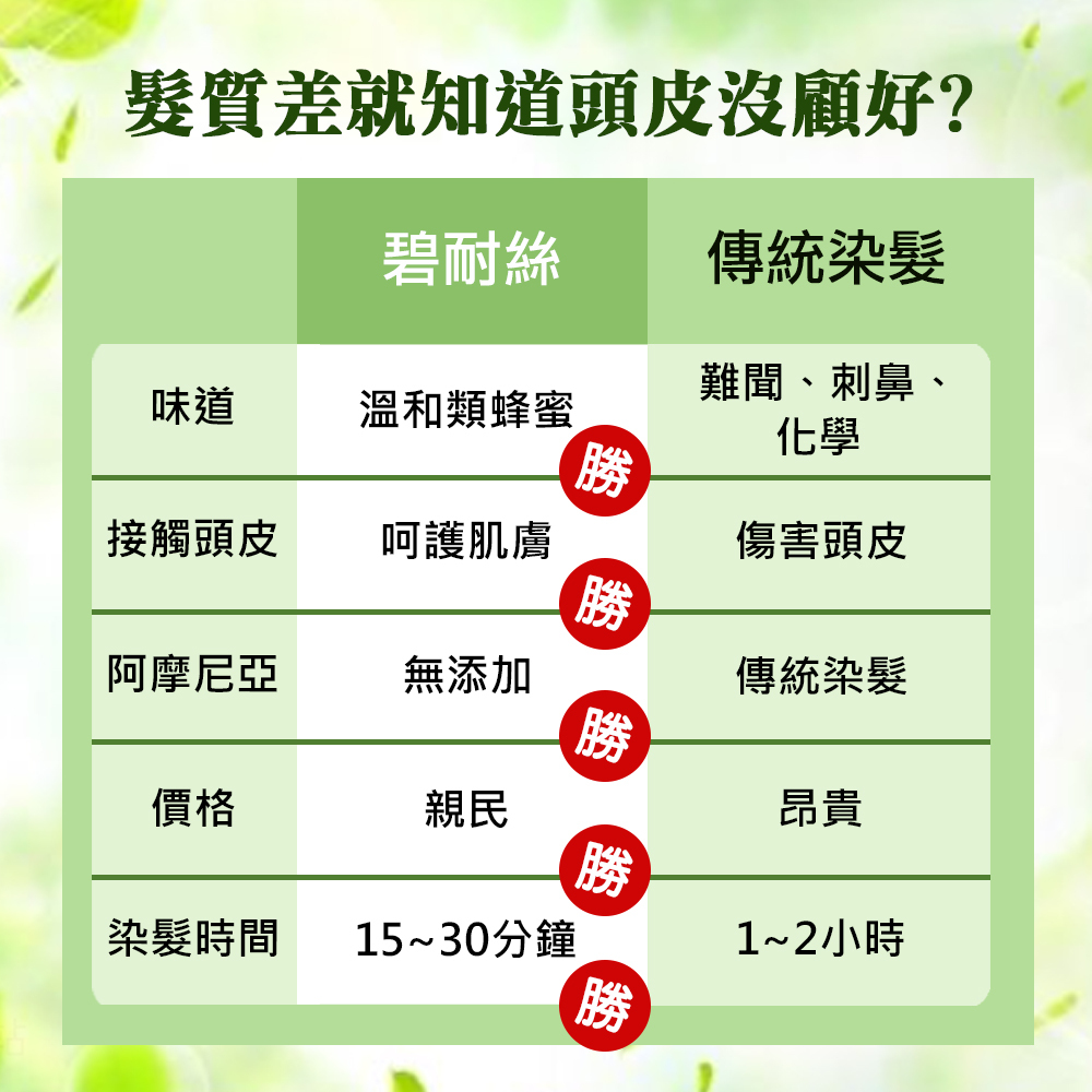 | 使用說明 | 頭髮半濕狀態, 撕開裸包包裝封口處,裸包有AB兩劑 都要擠出, 攪拌數秒後,倒入手中, 搓洗頭髮概念 讓每根頭髮都能沾到顏色, 靜待15分鐘,就能洗掉。 更多相關碧耐絲染髮影集,歡迎搜索 FB : 碧耐絲 |